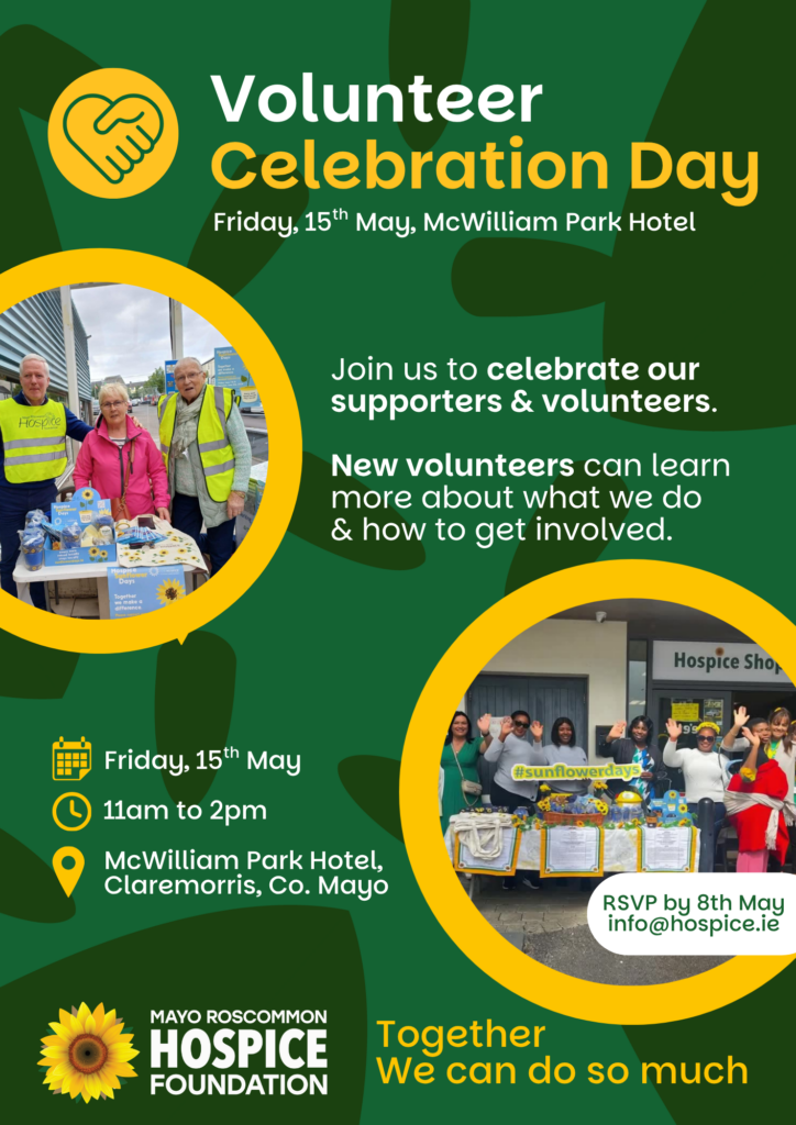 Volunteers are an essential part of supporting the Mayo Roscommon Hospice Foundation. From fundraising and community events to awareness and local initiatives, volunteering helps bring people together around care, compassion and shared purpose.